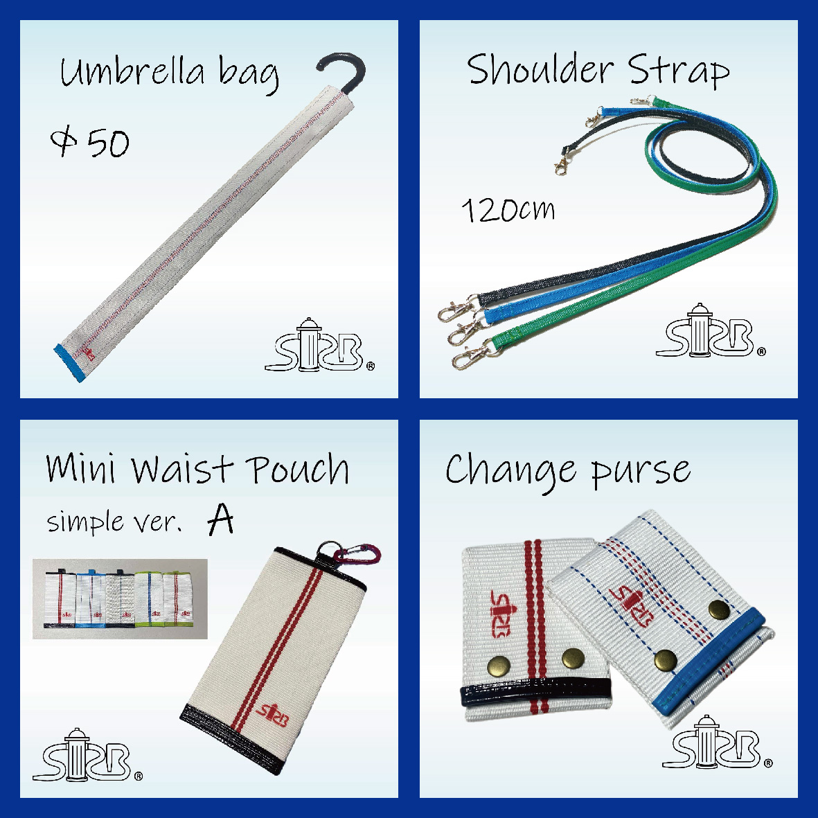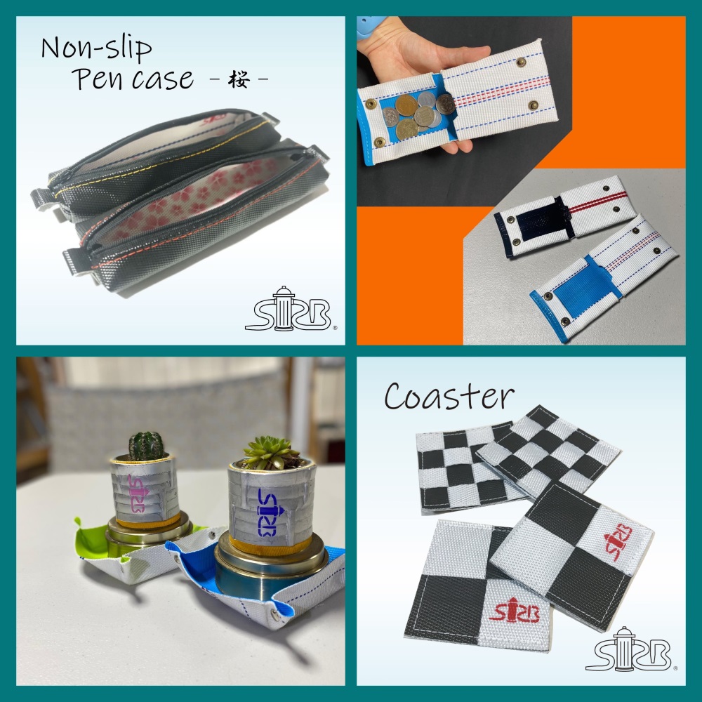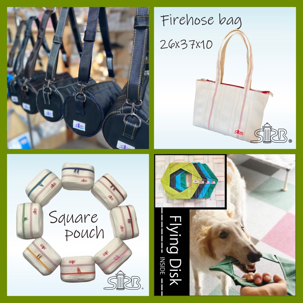 消防ホースを再利用した小物やバッグの販売を行います。