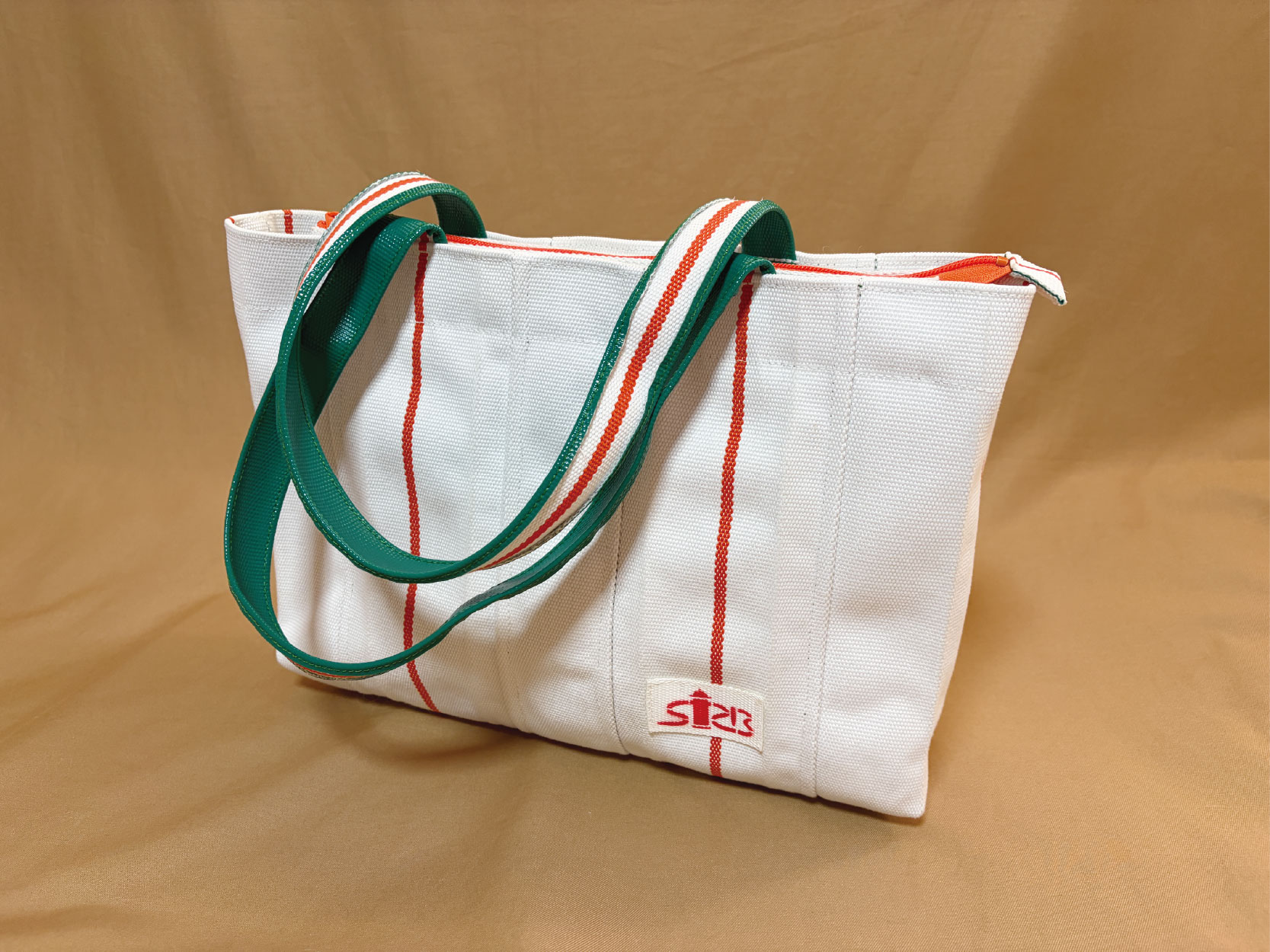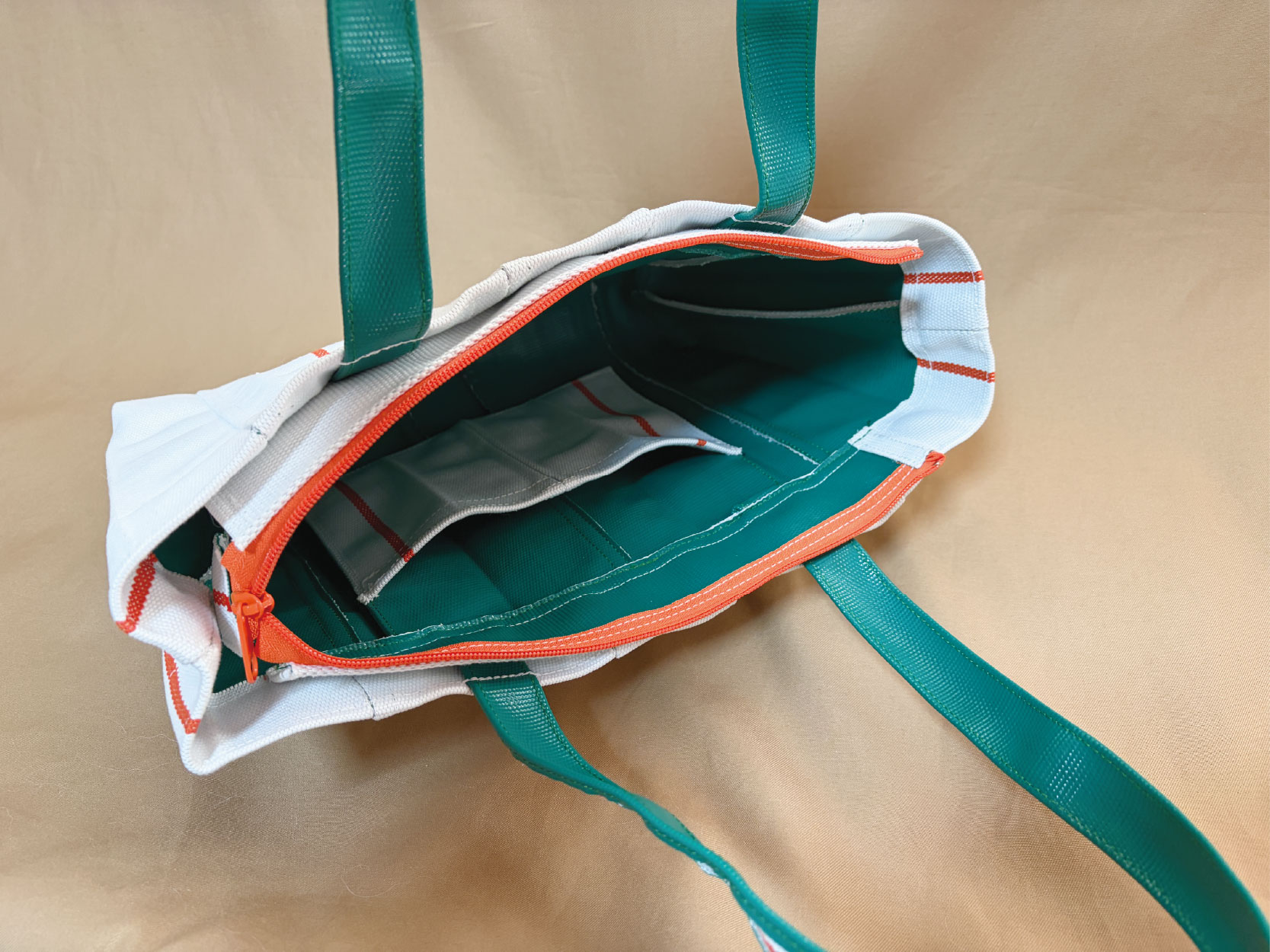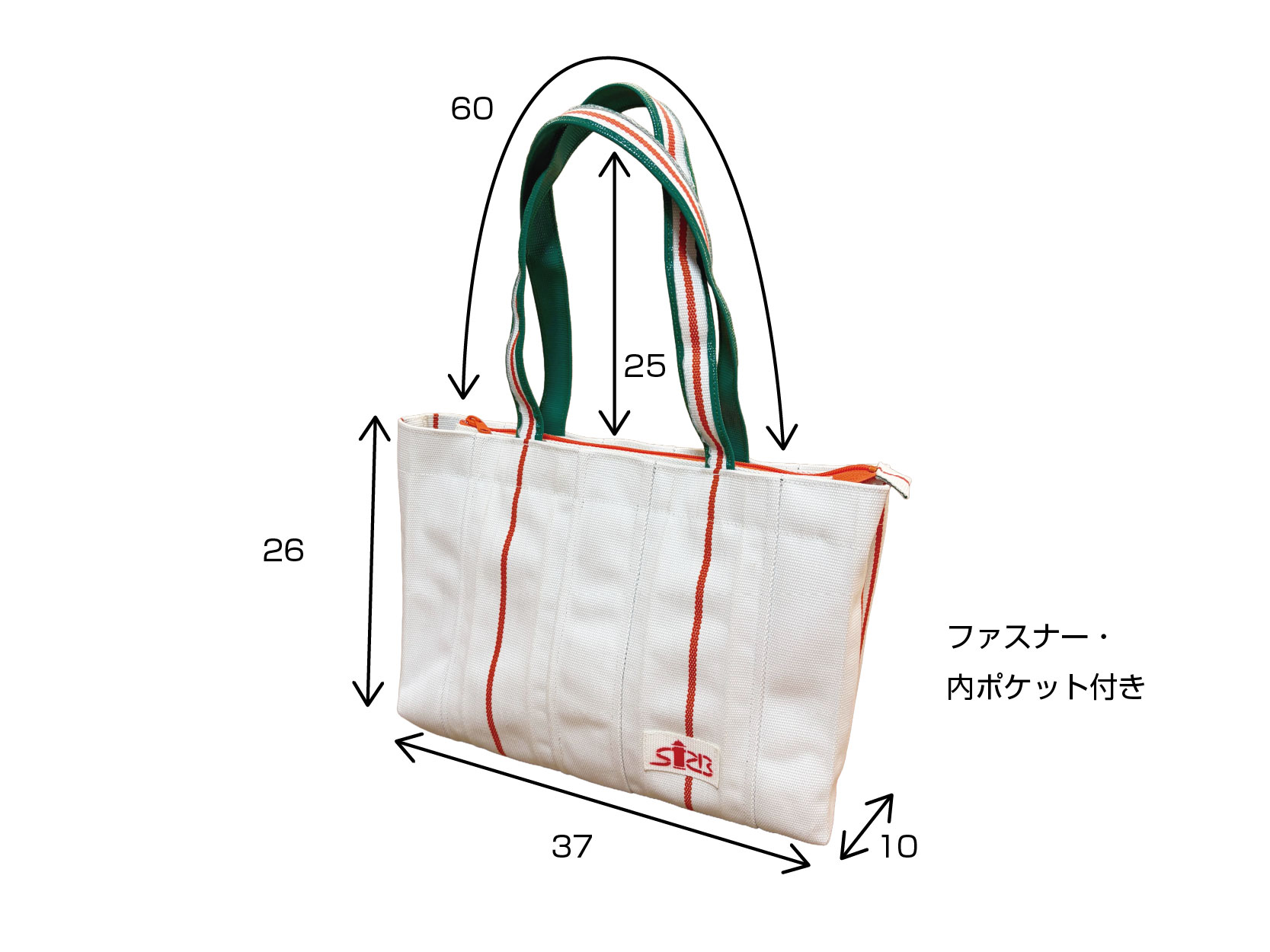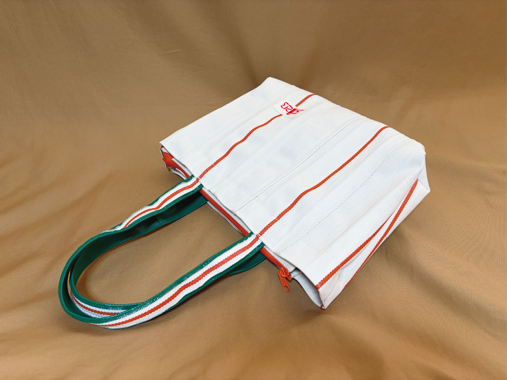 消防ホース製のバッグです。 (表布)オレンジライン入り×(内側樹脂)緑 【サイズ】 高さ 26cm×幅 37cm×まち 10cm 持ち手 60cm ★内ポケット付き ★ファスナー付き 発送方法:ゆうパック(送料は地域により異なります。)